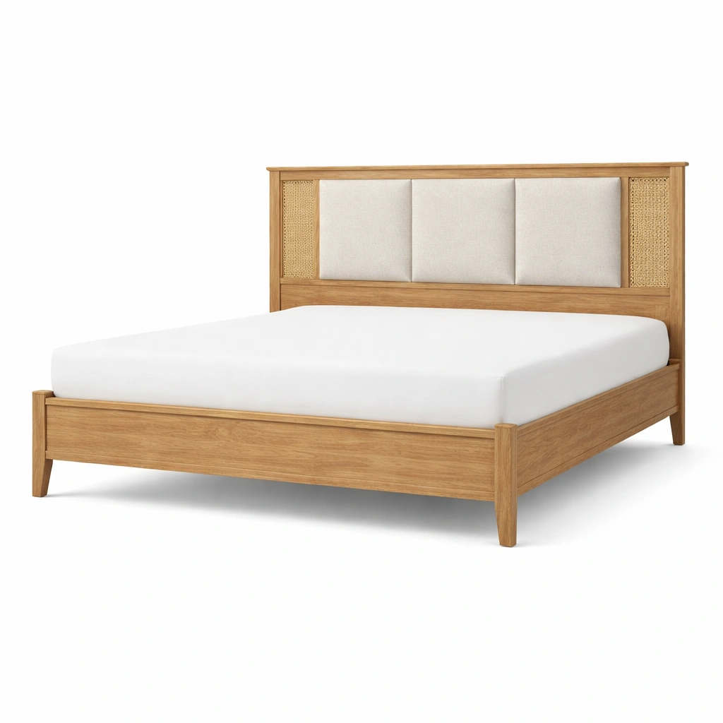 Material: Estructura de madera, cabecero acolchado con tela de poliéster, detalles de ratán.
